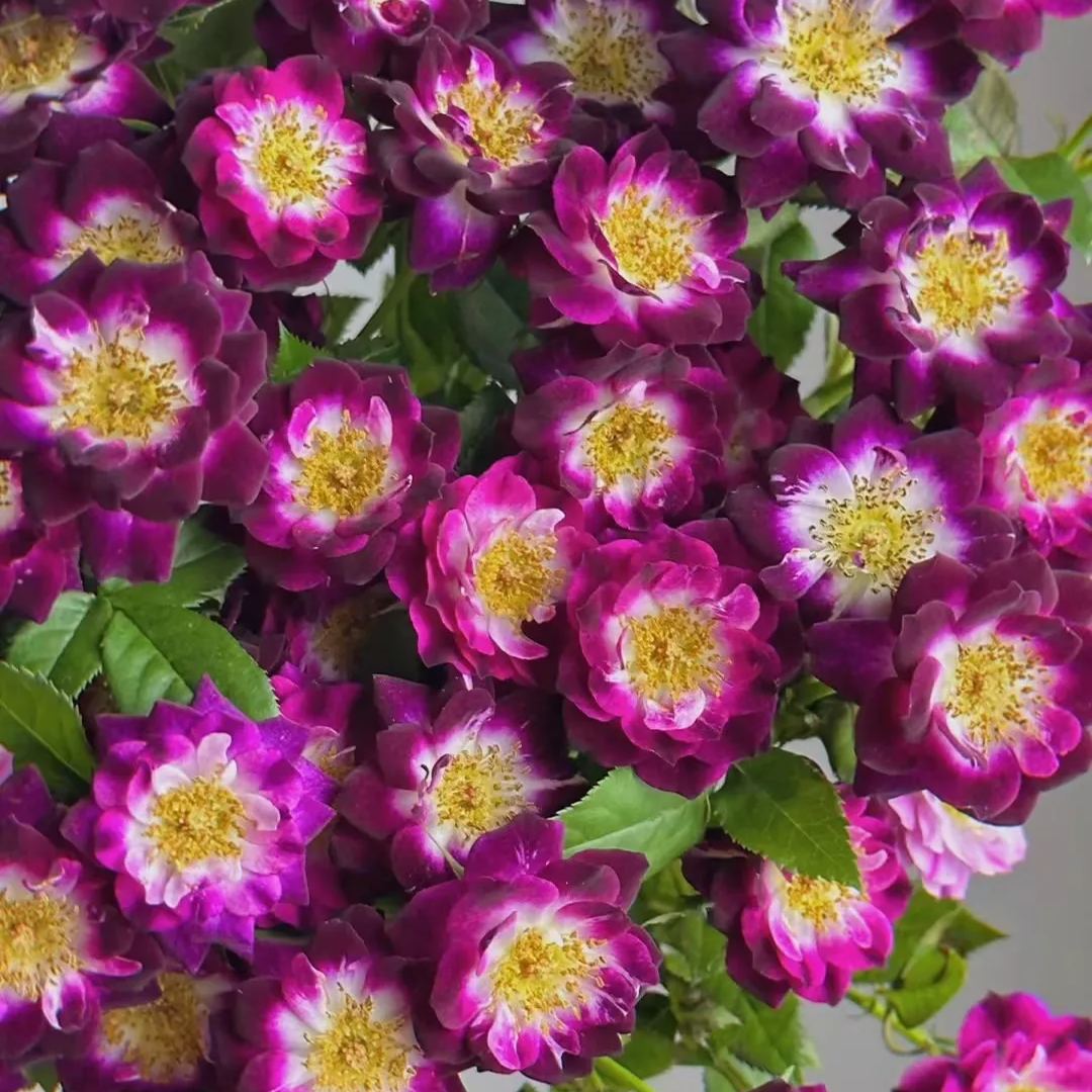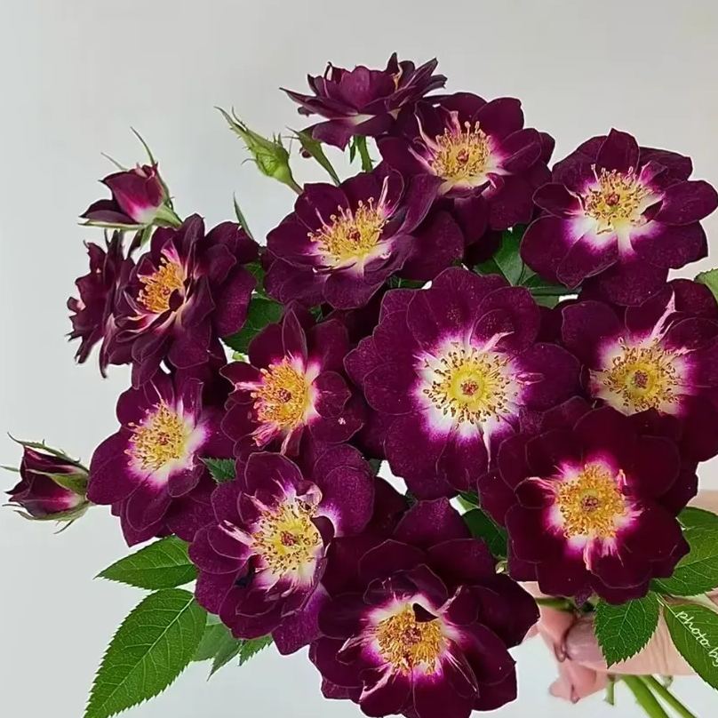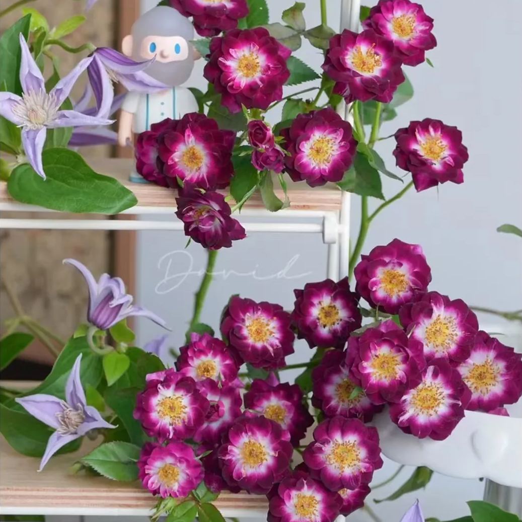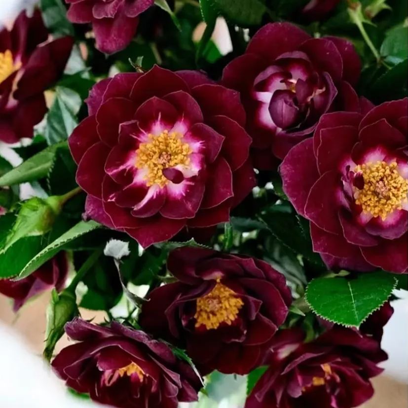 Mysteriously novel black-purple…that alone draws some attention. But wait until you get a whiff of the strong clove spice perfume. That's a killer combo that will seduce even regular rose lovers to try this little gem. Her sparkling white 'eye' lights up each velvety blossom, making the unique color illuminate against the ackground of glossy green leaves. Tucks easily into any landscape…but also makes a striking conversation piece in a decorative pot or as an 18" tree. Darkens up in cooler conditions.
